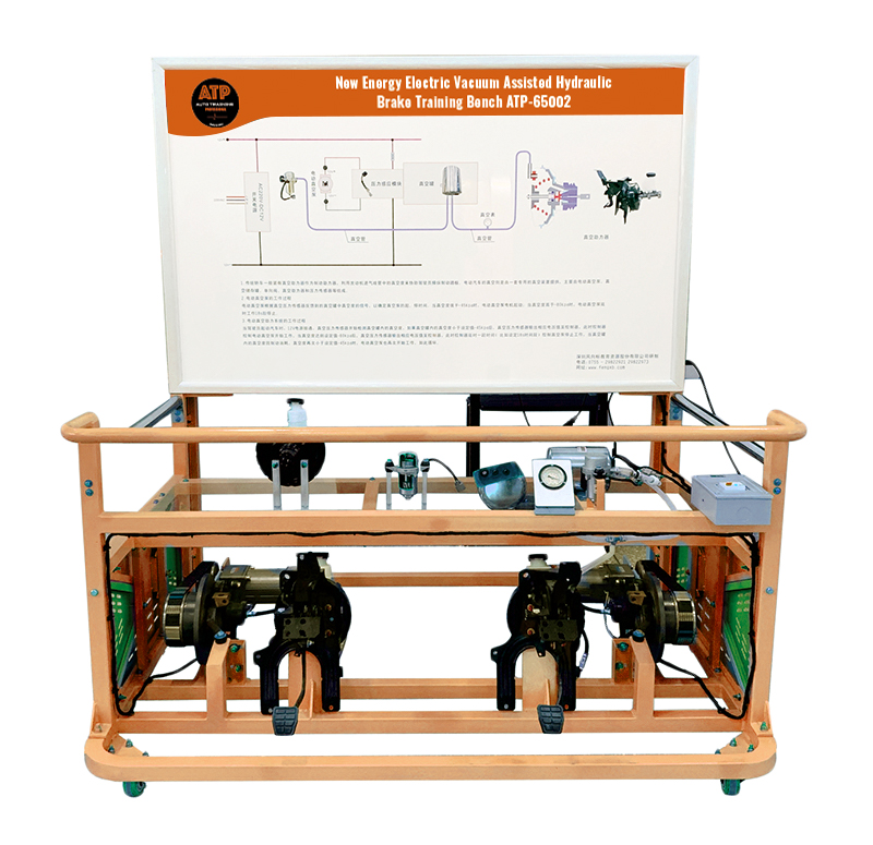 Thể hiện điều khiển kết nối, vị trí lắp đặt và các thông số vận hành giữa các thành phần hệ thống phanh thủy lực trợ lực chân không xe điện, thông qua đồng hồ đo chân không để hiển thị mức độ chân không, để học viên có thể biết nguyên lý bơm chân không kích hoạt chân không, để đào tạo khả năng phân tích lỗi và xử lý sự cố của học viên đối với bộ tăng áp chân không điện.